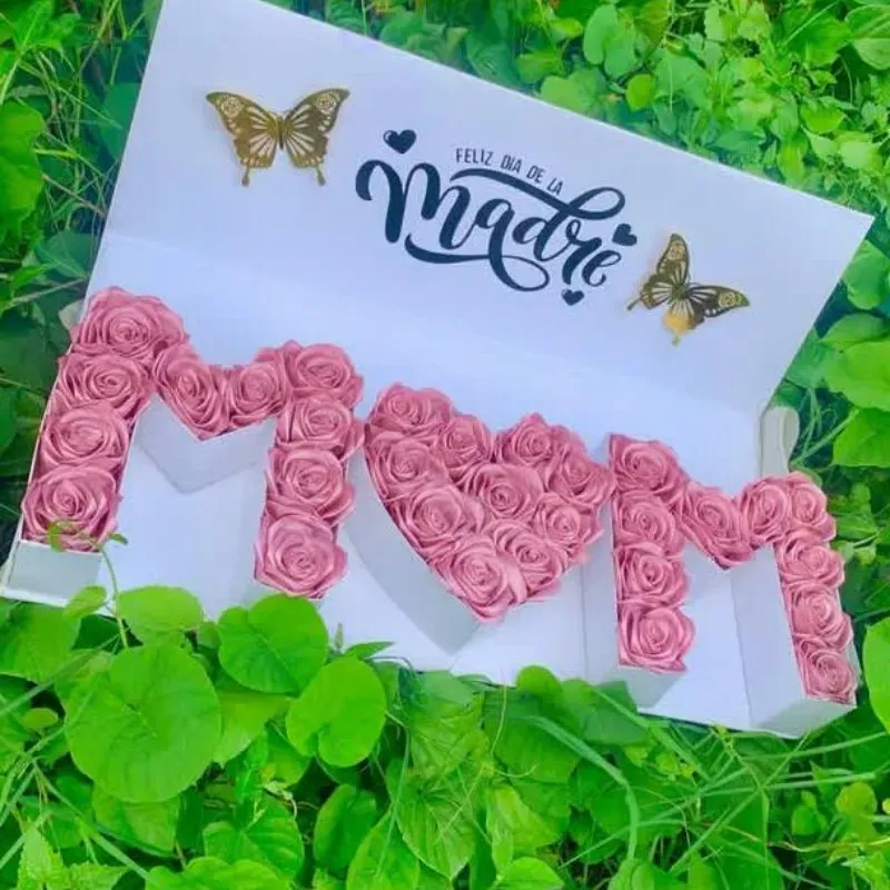 Diseño exclusivo Box libro con letra MOM para expresar tu amor de la forma más elegante , acompañada de rosas eternas