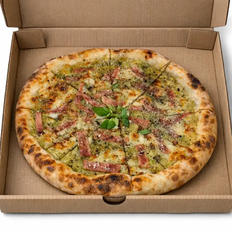Salsa Pesto como base, sobre la que descansa queso de alta calidad fusionado con el sabor y aroma de la pancceta, un poco de pimienta negra recién molida y aceite de oliva virgen extra. Parmesano al final para resaltarlo todo.
