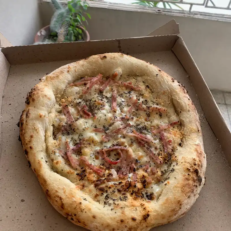 Mozarella, parmesano, bacon, ajo y albahaca, con una salsa Bianca
