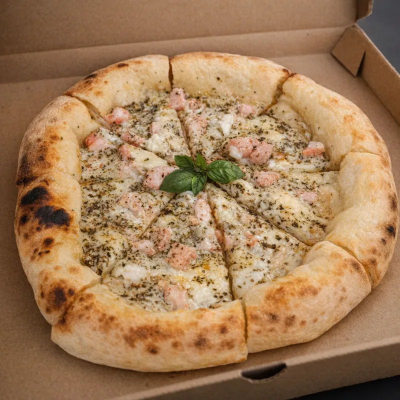 Masa de larga fermentación, a la que se añade salsa bianca, fundiéndose sobre ella queso de alta calidad, parmesano, orégano, albahaca, pimienta negra, lomo ahumado, aceite de oliva.