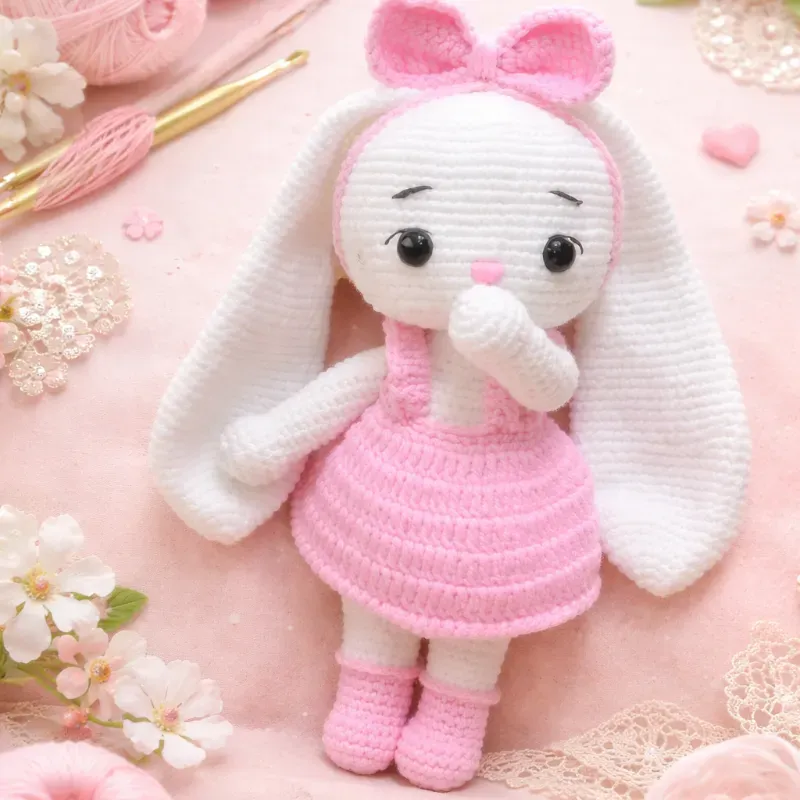 Enamórate de nuestra dulce conejita, una pieza tejida totalmente a mano que combina la delicadeza del estilo coquette con la maestría del crochet profesional. Con sus largas orejas caídas, su tierno vestido rosa y su lazo a juego, es el detalle perfecto para decorar una habitación infantil o para sorprender a alguien especial con un regalo único.