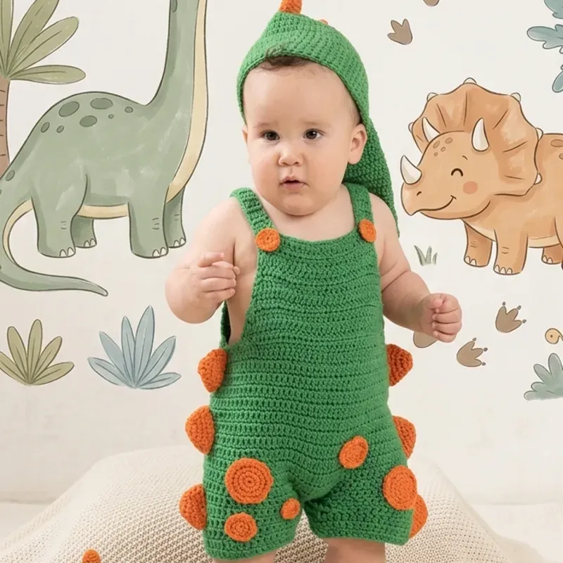 Divertido overol temático de dinosaurio, tejido totalmente a mano. Es una pieza cómoda, fresca y llena de detalles en relieve que lo hacen único. Ideal para cumpleaños, sesiones de fotos temáticas o simplemente para un día de juegos con mucho estilo.
