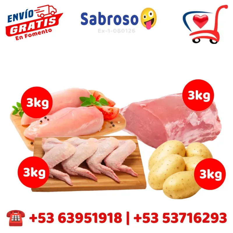 3 Kg de pechuga de pollo sin hueso y sin piel. 3 Kg de lomo de cerdo deshuesado. 3 Kg de alitas de pollo. 3 Kg de papas importadas.