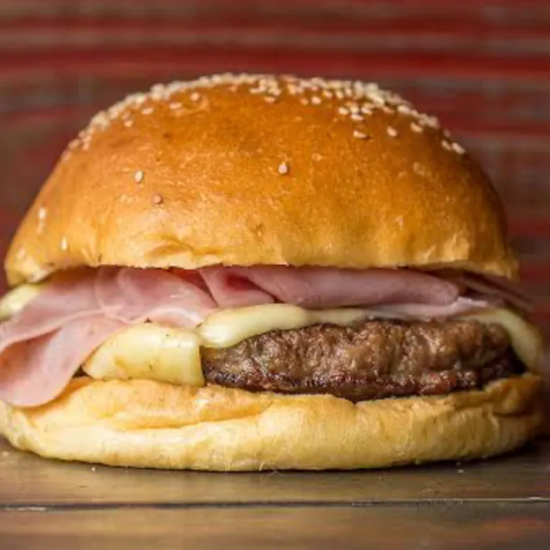 Hamburguesa de jugosa carne de cerdo, jamón y queso derretido, servida en pan suave tostado. 🍔