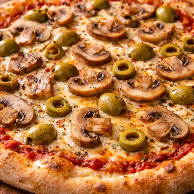 Pizza Selecta con salsa de tomate, queso blanco , champiñones frescos y aceitunas, una combinación clásica y sabrosa. 🍕