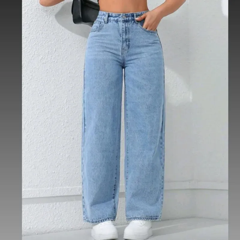 Pantalón de mezclilla en tono azul, de corte recto, con diseño limpio y atemporal que estiliza la silueta y brinda comodidad.