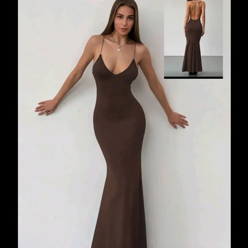 Vestido largo en tono carmelita oscuro, con espalda completamente descubierta y delicadas cintas que crean un diseño elegante y minimalista.