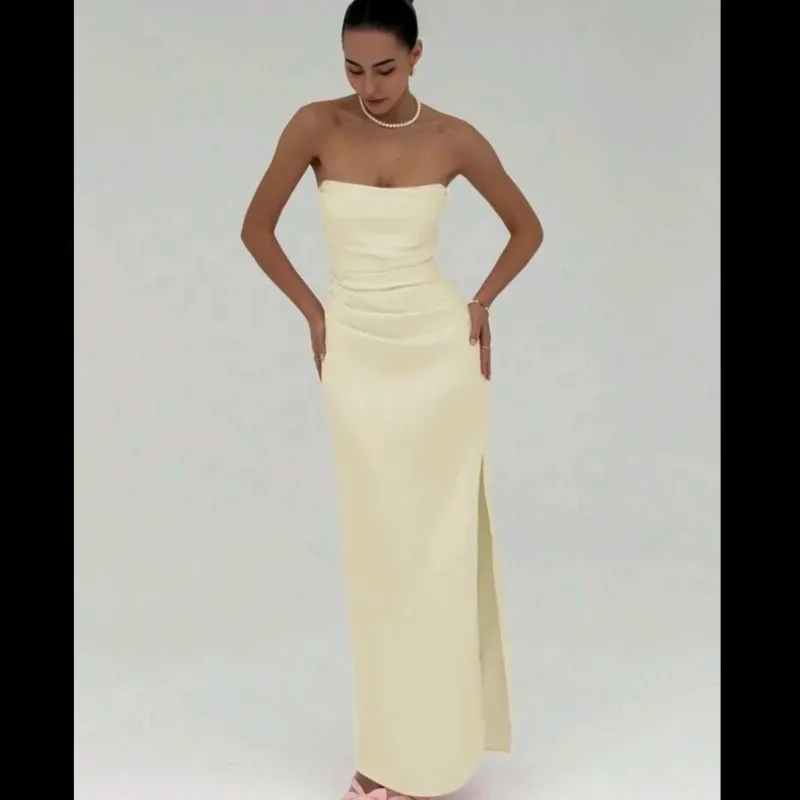 Vestido midi de satén en tono marfil con matices amarillo clarito, sin tirantes, con abertura lateral en el muslo y cierre discreto en la espalda.