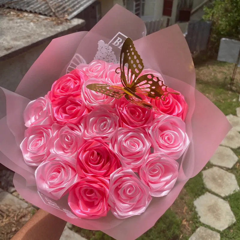 Son 19 rosas al color o colores que usted escoja y traería una mariposa envueltas en papel coreano