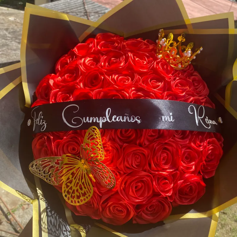 Son 50 rosas al color o colores que usted escoja y traería 2 mariposas y una corona envueltas en papel coreano