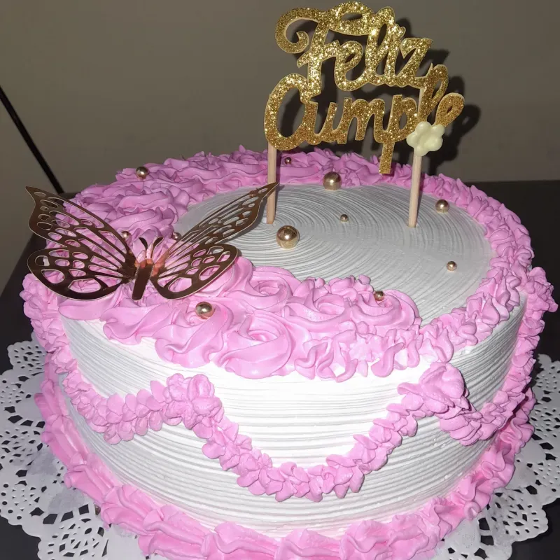 Panetela mojada con almibar , con 2 rellenos de leche condensada cocinada , vestida de nata y decoración a gusto del cliente.