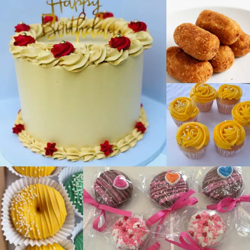 12 Donitas,12 cupcakes, 12 chocoletas, 20 croquetas, 1 mini cake de nata 12 cm un relleno