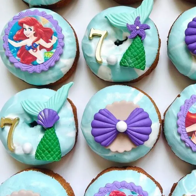 Mini donitas de chocolate blanco personalizadas con decoracion comestible