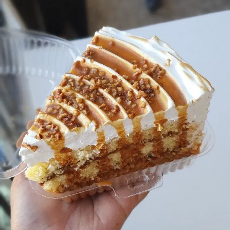 Porcion de panetela humeda relleno ligero y decoracion con crema o mousse