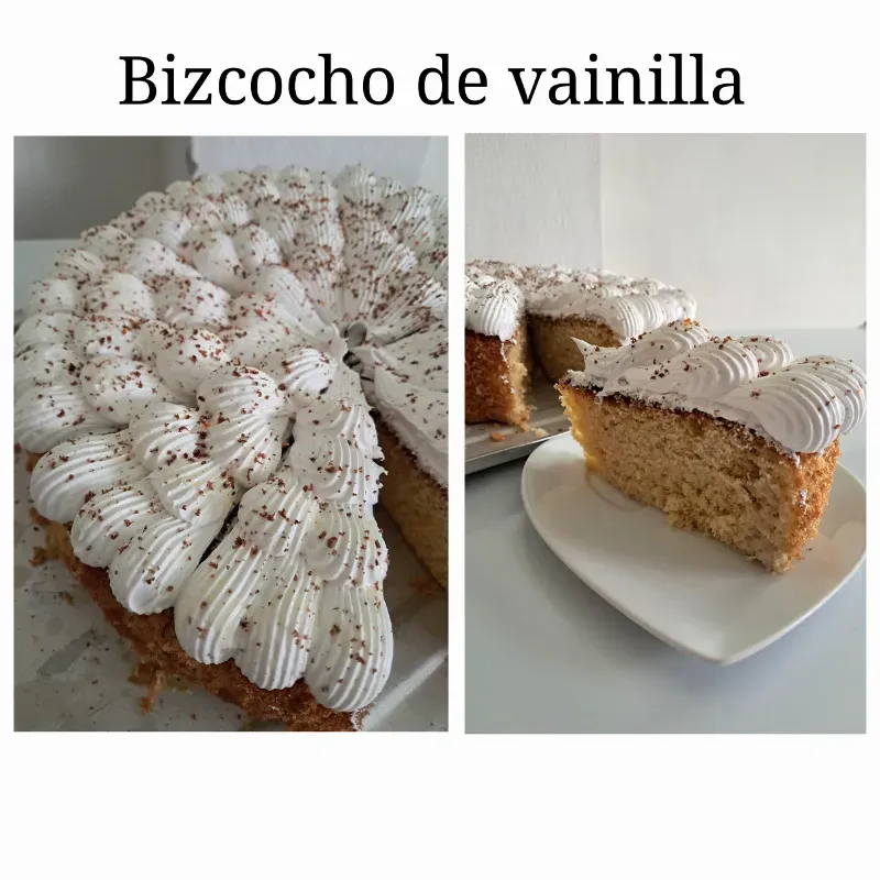 Bizcocho de vainilla humedecido con almíbar y decorado con merengue