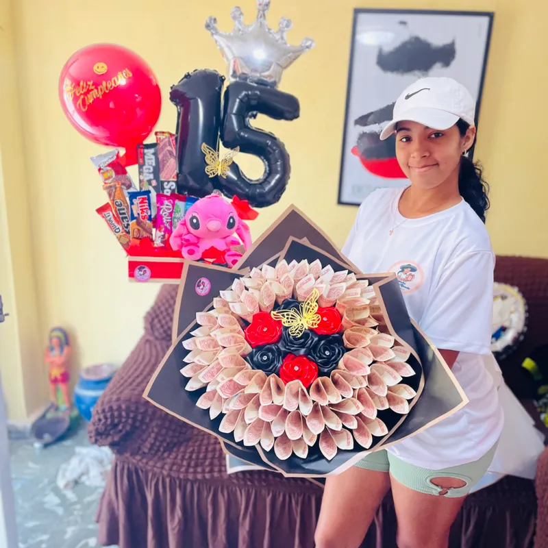 Cesta con 12 confitura peluche número de 16 pulgadas y ramo buchón con 5000 cup en de a 100