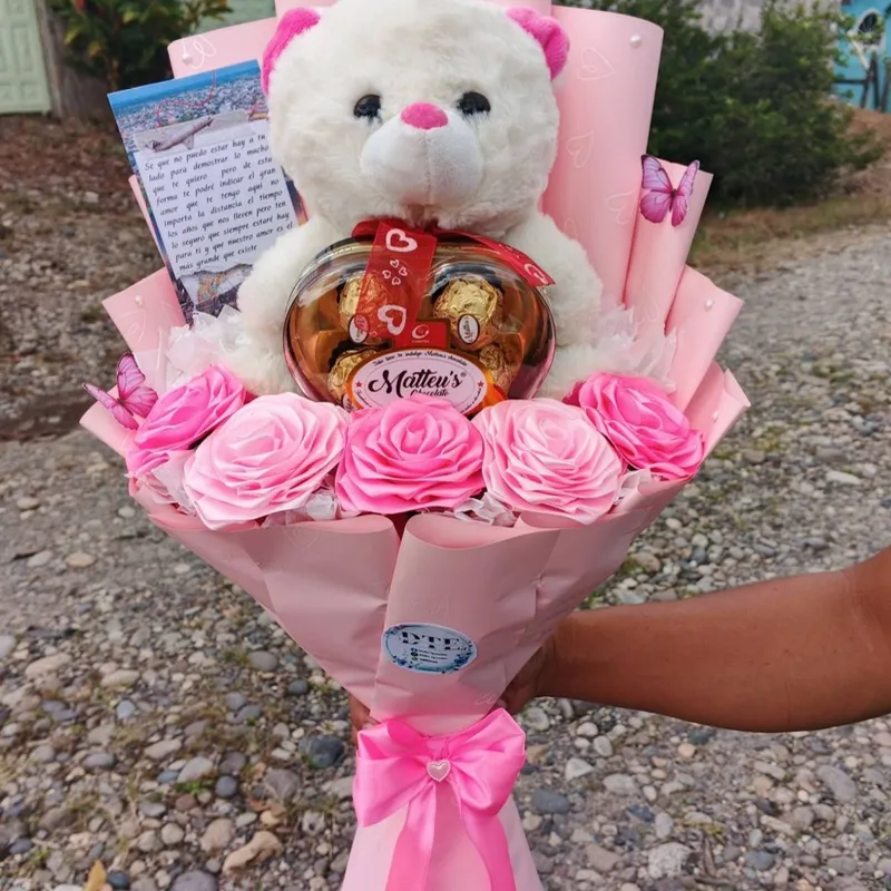 Ramo de peluche con 5 rosas caja de bombón nota de su preferencia