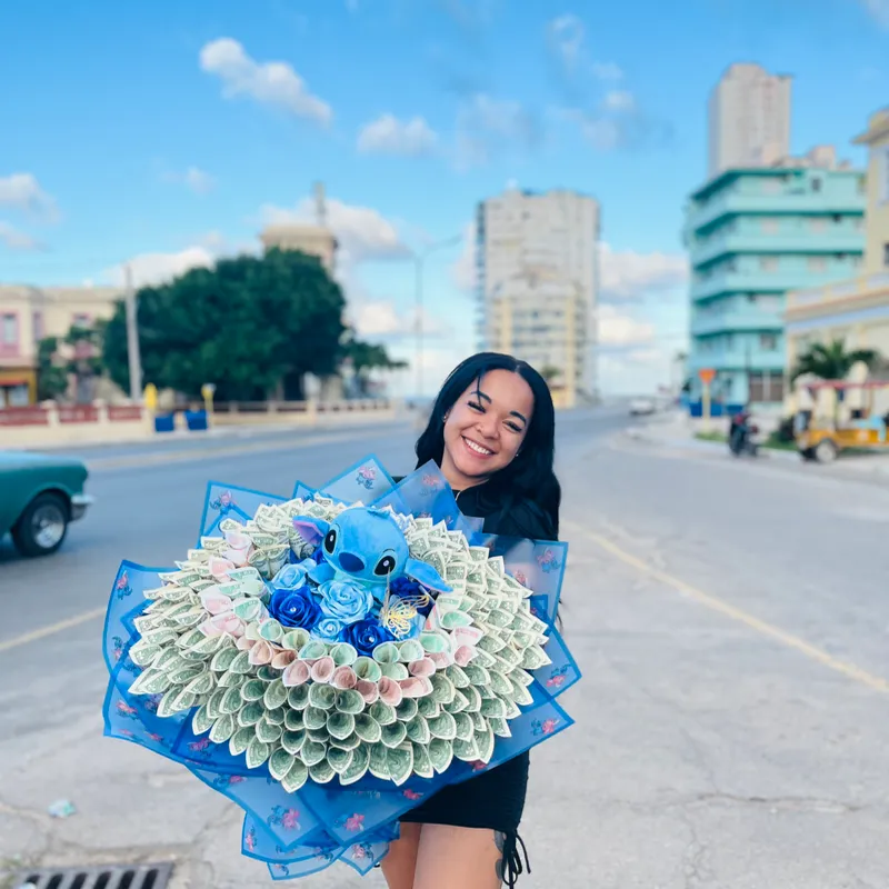 Ramo con peluche de stich e 10 rosas eternas 100 billetes de a 1 dólar 10000 cup de 1000 y 5000 cup de 500