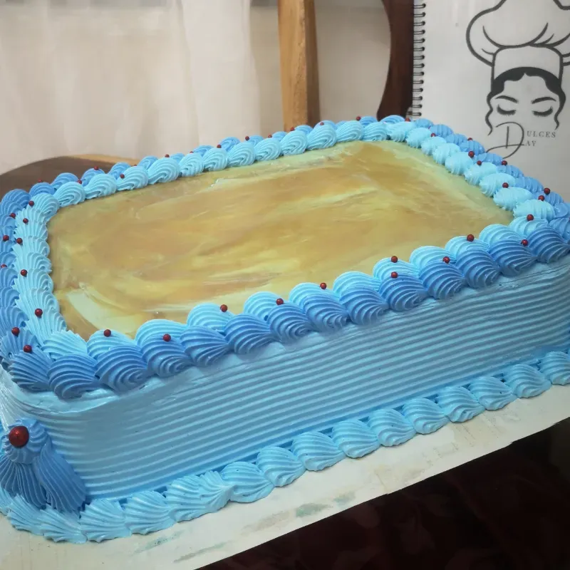 Cakes rectangular que mide 37 cm de largo por 27 cm de ancho, vestido de merengue con dos capas de panetela de vainilla y una capa de relleno a elegís por el cliente según los sabores que tengamos disponibles.