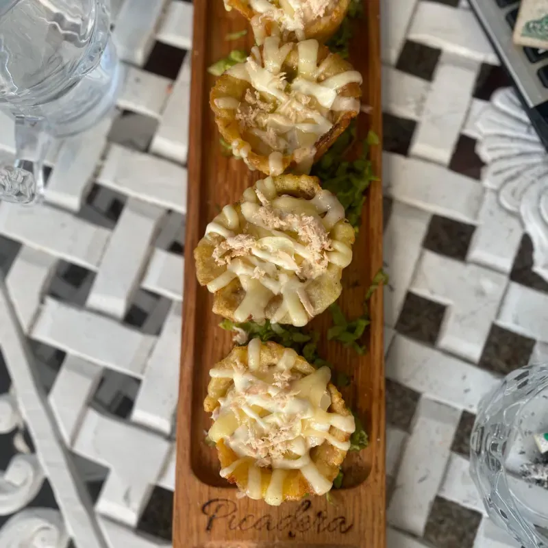 4 canastas de plátano frito rellenas de atún,cebolla,mayonesa y queso.