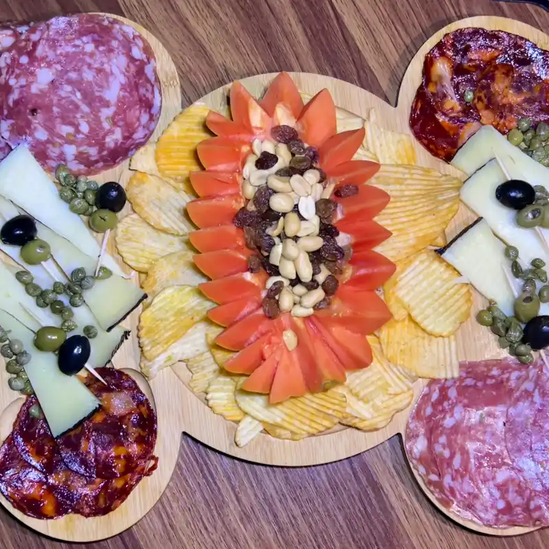 contiene queso de trufa , chorizo ibérico , salame italiano , frutas , aceitunas y papitas