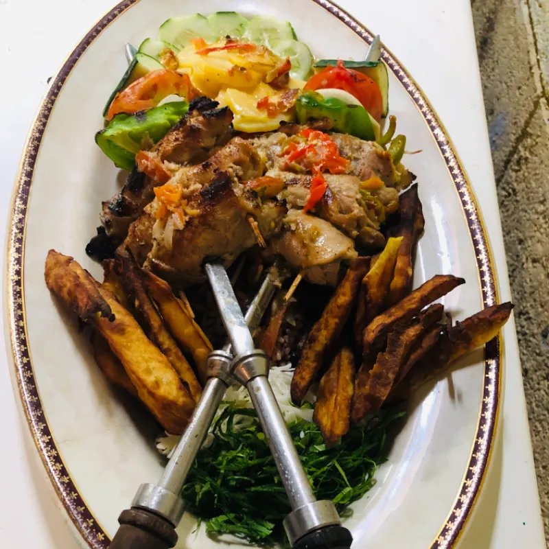 Bistec de Cerdo, Vegetales, Papas Fritas y Congri