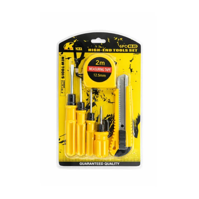 • Set completo de 6 herramientas: incluye destornilladores, cúter retráctil y cinta métrica para múltiples tareas.