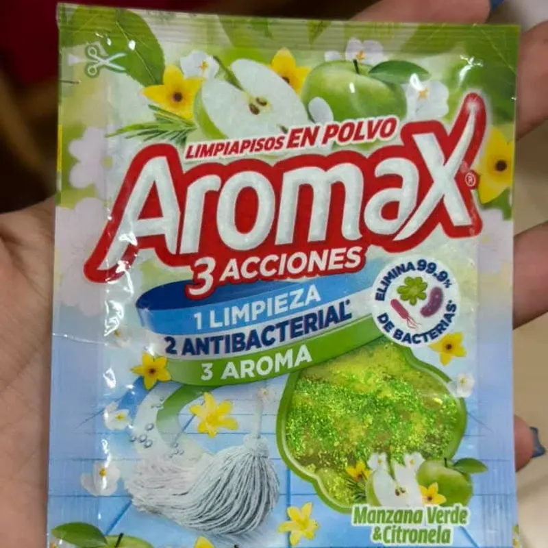 Detergente para suelos Aromax, paquete 10 g (Se prepara en un pomo de 4 litros de agua) El detergente para suelos Aromax en presentación de sobres de 10 gramos es un producto en polvo diseñado para una limpieza práctica y efectiva de pisos. Cuenta con fórmula de triple acción que permite eliminar suciedad, manchas y dejar una fragancia agradable. Muy adecuado para diluir y usar en diferentes tipos de superficies, como baldosas o pisos tratados.