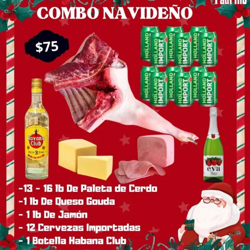 -13 a 16 Lb de Paleta de Cerdo -1 Lb Queso Gouda -1 Lb Jamón -12 Cervezas Importadas -1 Botella Havana Club -1 Botella de Cidra