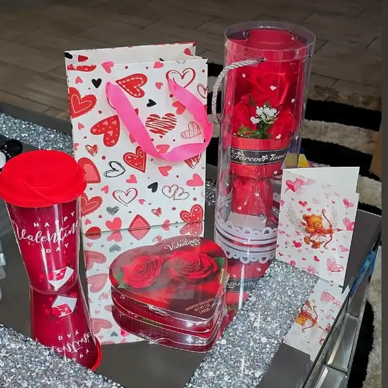 Contiene 1 Basó Termico 1 Tarjeta con sobre 1 caja de Bombones 1 Bolsa de Regalo primer 1 caja de flores