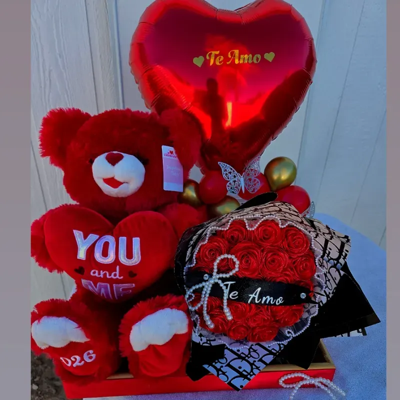 Contiene 1 Ramo de Rosas grande 1 Peluche grande el color y forma puede variar según disponibilidad 1 Bandeja de madera adornada con globos