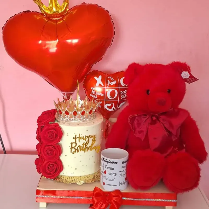 Hermoso Regalo contiene 1 Cake Primer incluida la corona y la Banda 1 Peluche grande el modelo puede cambiar según disponibilidad 1 Taza 1 Vela ⛔️⛔️⛔️ Pedido mínimo 2 días de anticipación 1 Bandeja de Madera adornada con globos