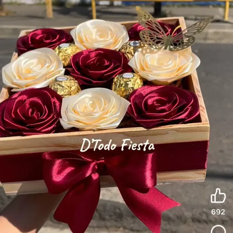 Contiene: -9 rosas eternas -4 bombones -1 mariposa Puede elegir el color de las rosas