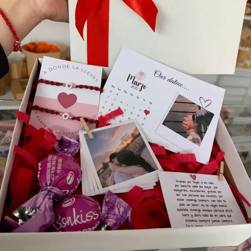 Contiene: -2 bombones -1 pareja de pulseras personalizada -1 postal de mes -1 tarjeta personalizada -7 fotos pequeñas Color a elección.