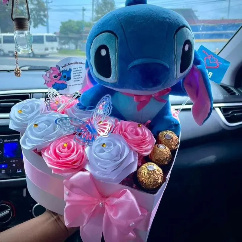 Contiene: -8 rosas eternas. -Peluche de Stitch -3 bombones -Tarjeta personalizada -2 mariposas Color de las rosas y lazo q su gusto