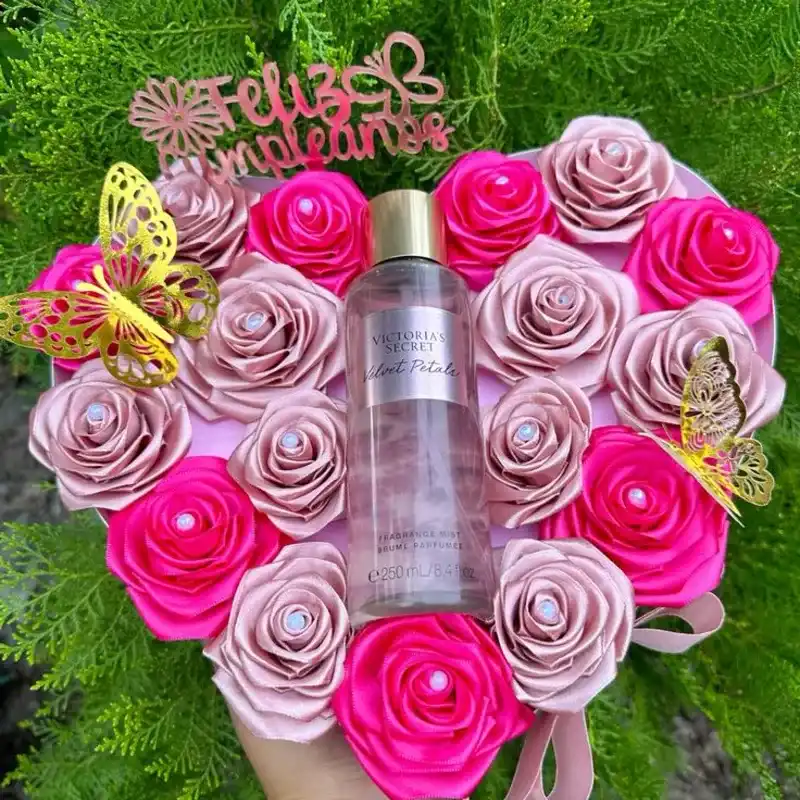Contiene: -Colonia o perfume -17 rosas eternas -2 mariposas -Puede incluir 2 fotos pequeñas y 1 tarjeta personalizada. Color a su elección