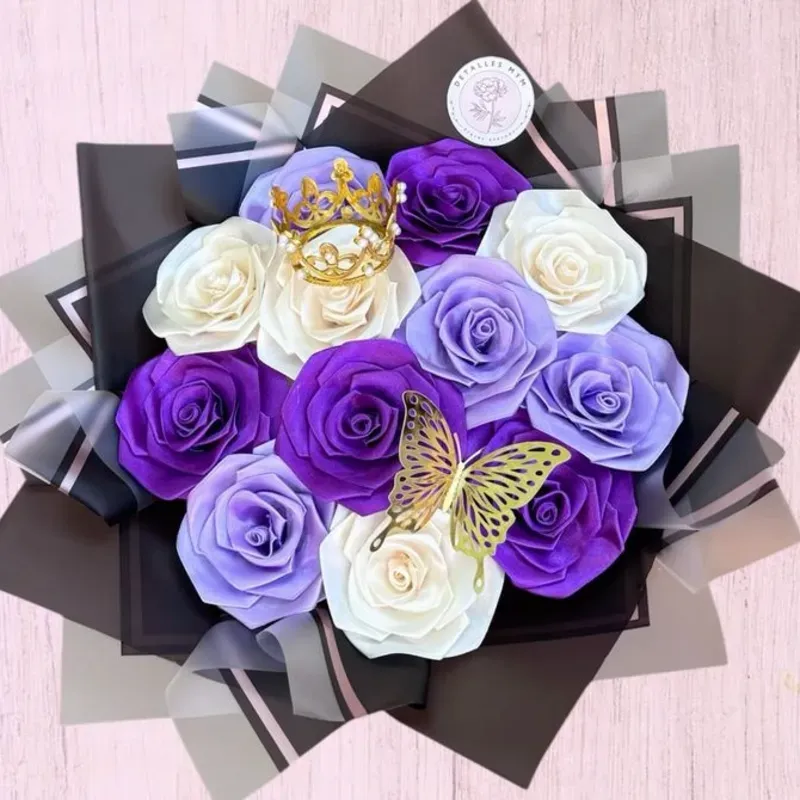 Contiene: -12 rosas eternas (Puede elegir el color) -1 corona. -1 mariposa.