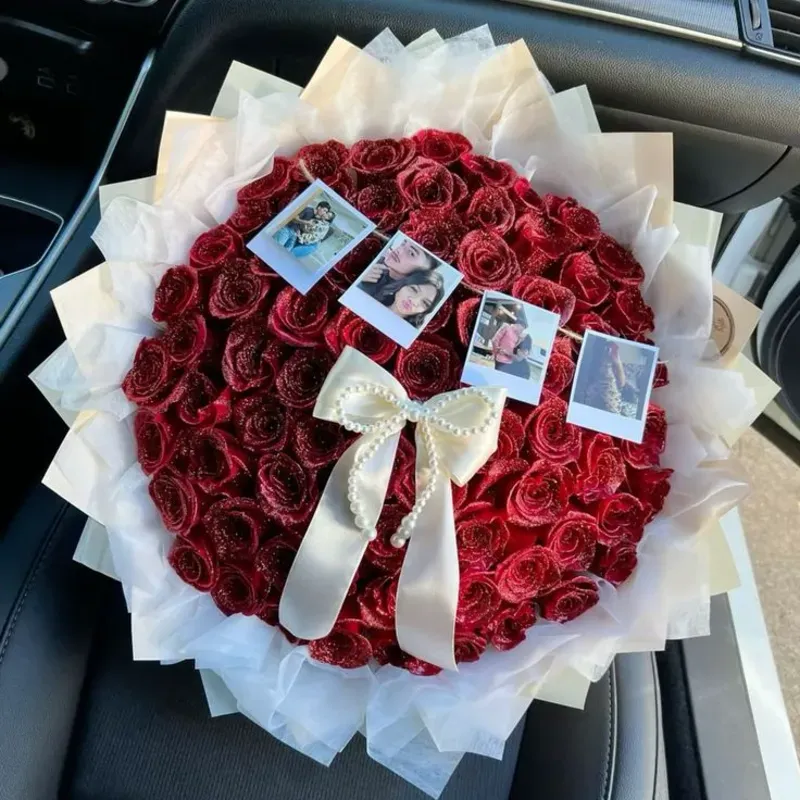 Contiene: -40 rosas eternas -Tendedera de fotos -Lazo doble (Cinta + Lazo) Puede elegir el color de las rosas y el papel para envolver el ramo