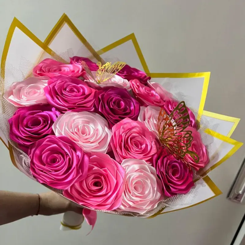 Contiene: - 19 rosas eternas. -2 mariposas Puede elegir el color del ramo y el papel para envolver el ramo