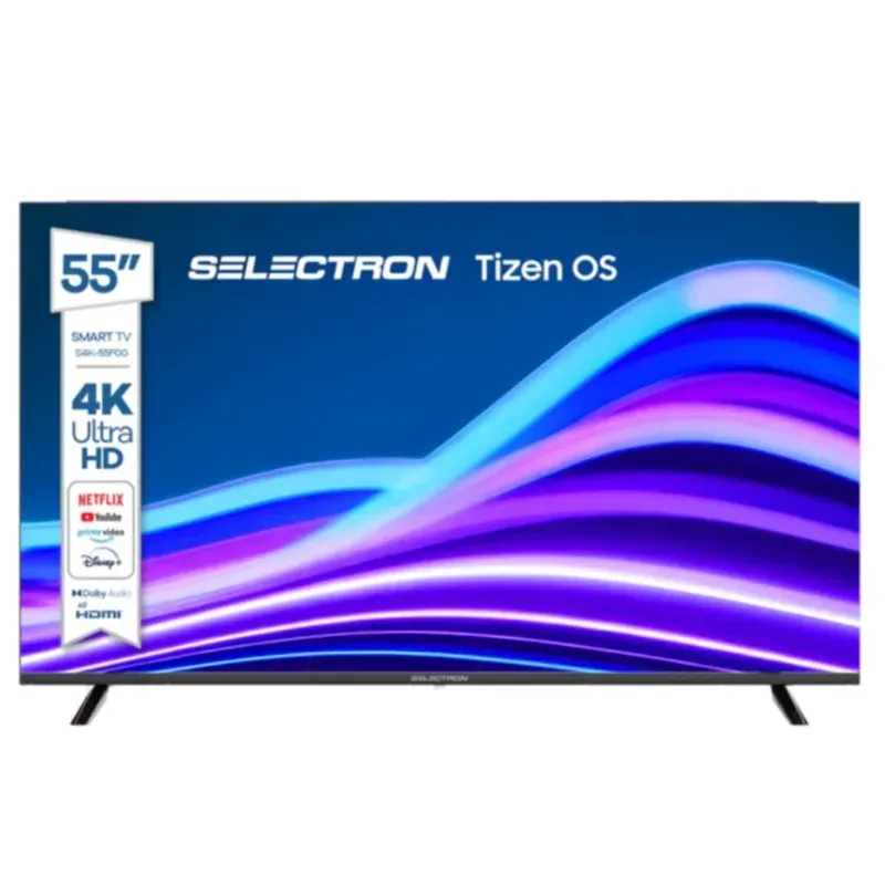 • Marca: SELECTRON • Modelo: S4K-55F00 • Pantalla LED de 55 pulgadas con resolución 4K Ultra HD (3840x2160) • Sistema operativo Tizen OS, intuitivo y eficiente, con acceso a una amplia gama de aplicaciones de entretenimiento. • Tasa de refresco de 60 Hz para imágenes fluidas. • Conectividad: 1 puerto HDMI, 1 puerto USB y sintonizador digital DVB-T. • Conectividad avanzada: incluye puertos HDMI, Bluetooth, Wi-Fi. • Sonido estéreo con dos altavoces de 10 W cada uno. • Garantía: 1 mes IMPORTANTE: Este Smart TV no cuenta con cajita HD interna