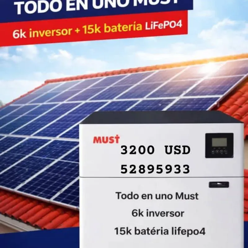 El sistema solar todo en uno MUST de 6kW es una solución integral que combina un inversor de onda pura con una batería de litio LiFePO4 de aproximadamente 15kWh en un solo equipo, ofreciendo energía confiable, respaldo automático y fácil instalación para hogares o negocios.