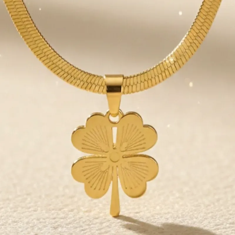 Clásica y lujosa cadena en forma de hueso de serpiente chapada en oro de 18K con colgante de trébol de la suerte, adecuada para uso diario.