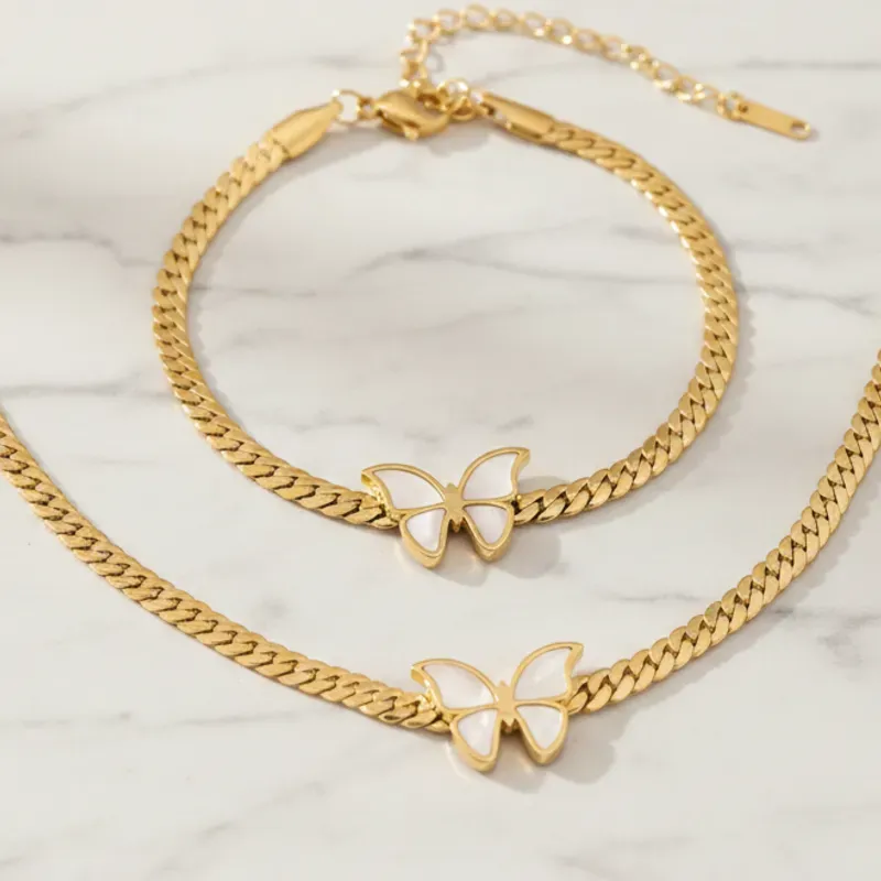 Set de 2 piezas: Collar de cadena de metal twist de estilo elegante y minimalista de alta gama europeo y americano + Brazalete, con decoración de mariposa blanca en collar y brazalete de acero inoxidable.