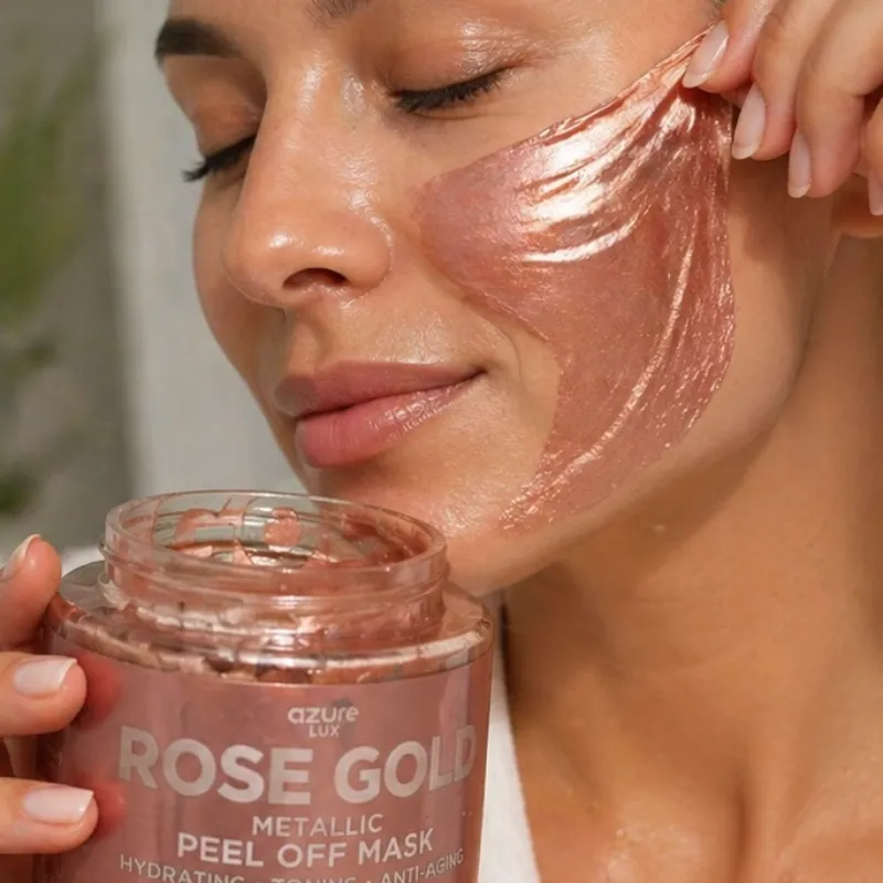 Mascarilla facial tipo peel-off con acabado metálico Rose Gold, formulada con oro 24K y extracto de rosa mosqueta para hidratar, tonificar y mejorar visiblemente la elasticidad de la piel. Su acción ayuda a remover impurezas, afinar la textura y aportar un efecto luminoso inmediato, dejando el rostro más firme, suave y revitalizado.