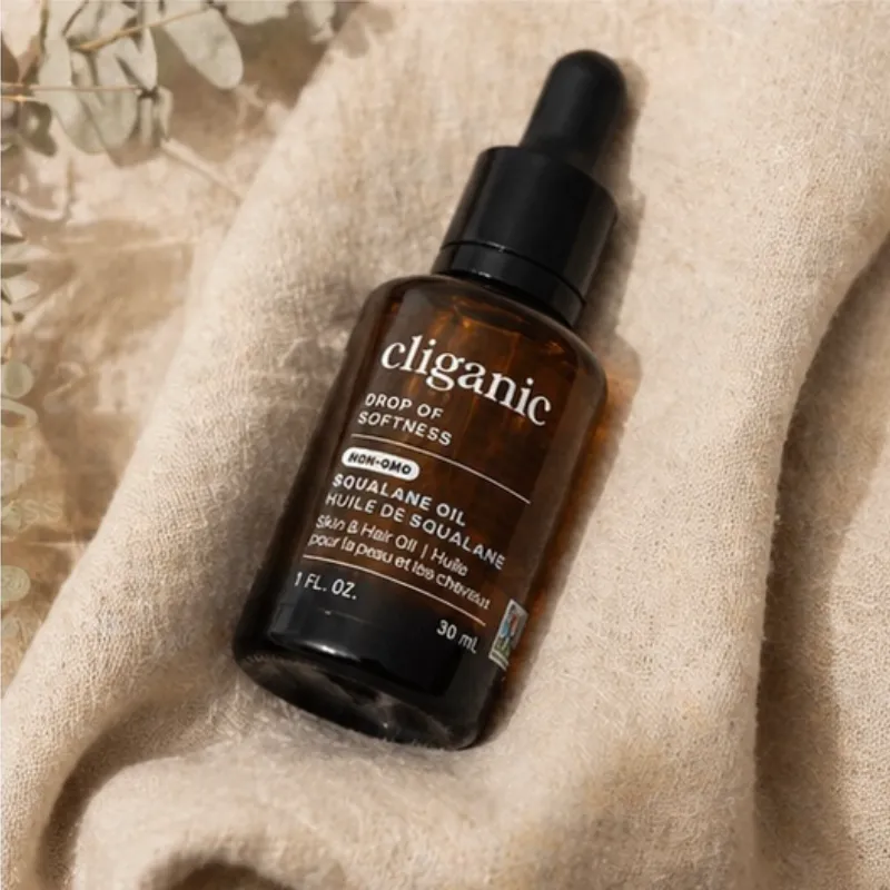 Sérum tipo aceite de la marca Cliganic, reconocida marca cosmética natural y orgánica, enfocada en productos limpios, veganos y libres de tóxicos. Contiene 30 ml y está formulado con escualano (squalane) 100%, un ingrediente altamente compatible con la piel.