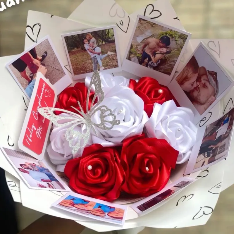 Ramo de 8 rosas con 8 fotos polaroids pequeñas