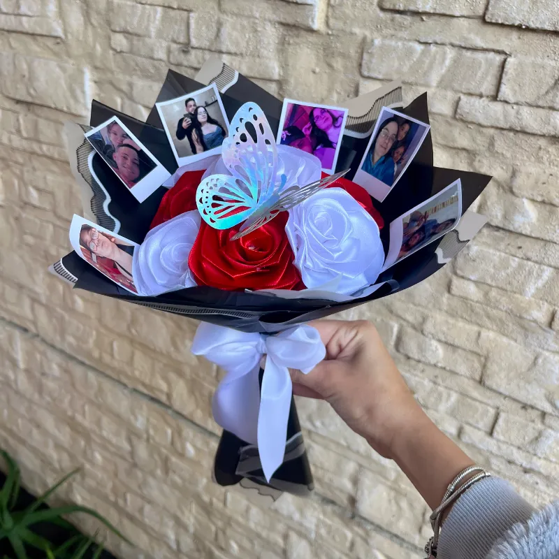 Ramo de 8 rosas con 8 fotos polaroids pequeñas