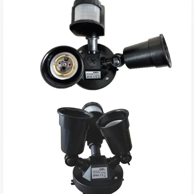 Aplique para exterior de luz dirigible y sensor de movimiento. Cuenta con dos socket para bombillo E27. Material PC