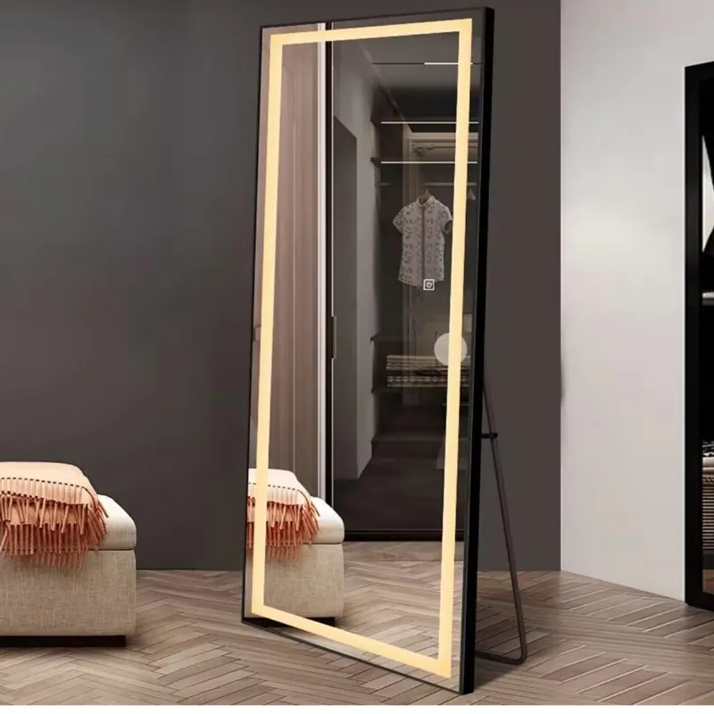 Espejo con soporte para piso y aditamentos para fijar a la pared, luz led con tres temperaturas de color. Dimensiones 1.60m altura y 50cm de ancho