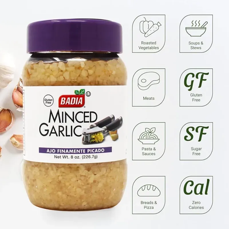 Ajo Finamente Picado en Agua de Badia Spices es la opción práctica y confiable para dar sabor auténtico a tus comidas sin pelar ni picar. Elaborado con ajo seleccionado y conservado en agua para mantener su frescura y aroma natural, es perfecto para salteados, salsas, guisos, adobos y todo tipo de preparaciones. ✔ Listo para usar ✔ Sabor intenso y natural ✔ Ahorra tiempo en la cocina ✔ Ideal para uso diario Un imprescindible en tu cocina para cocinar fácil, rápido y con el sabor tradicional del ajo.